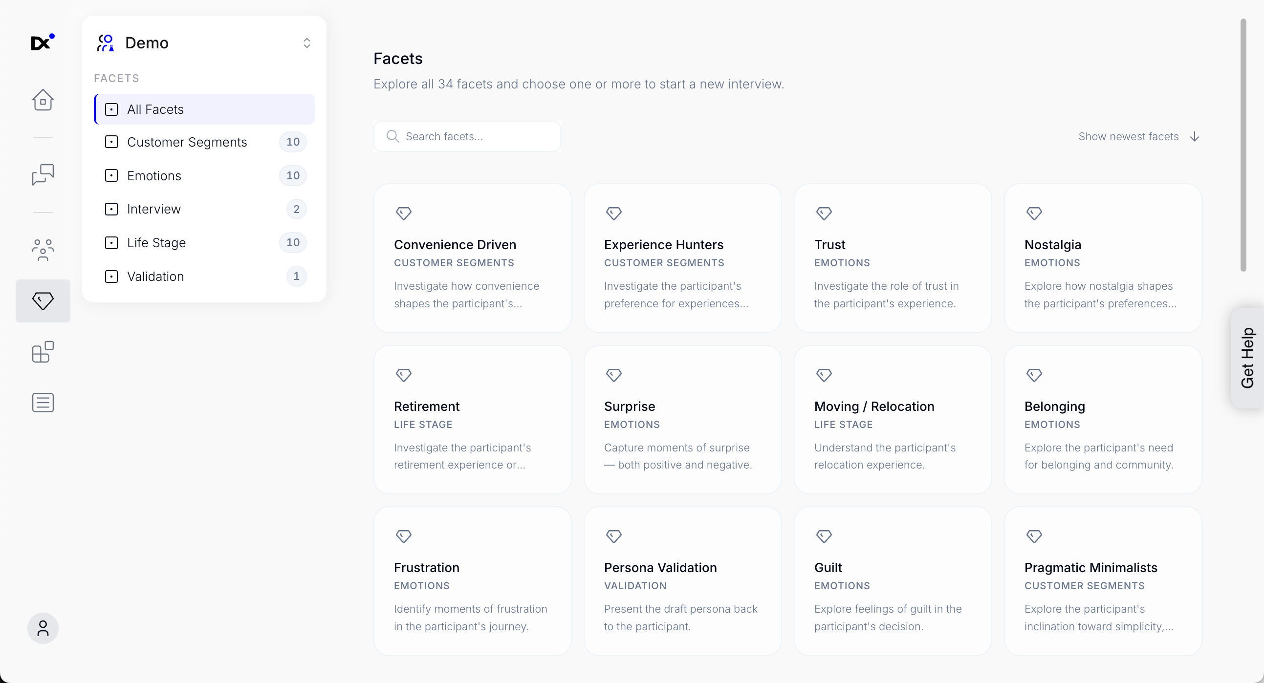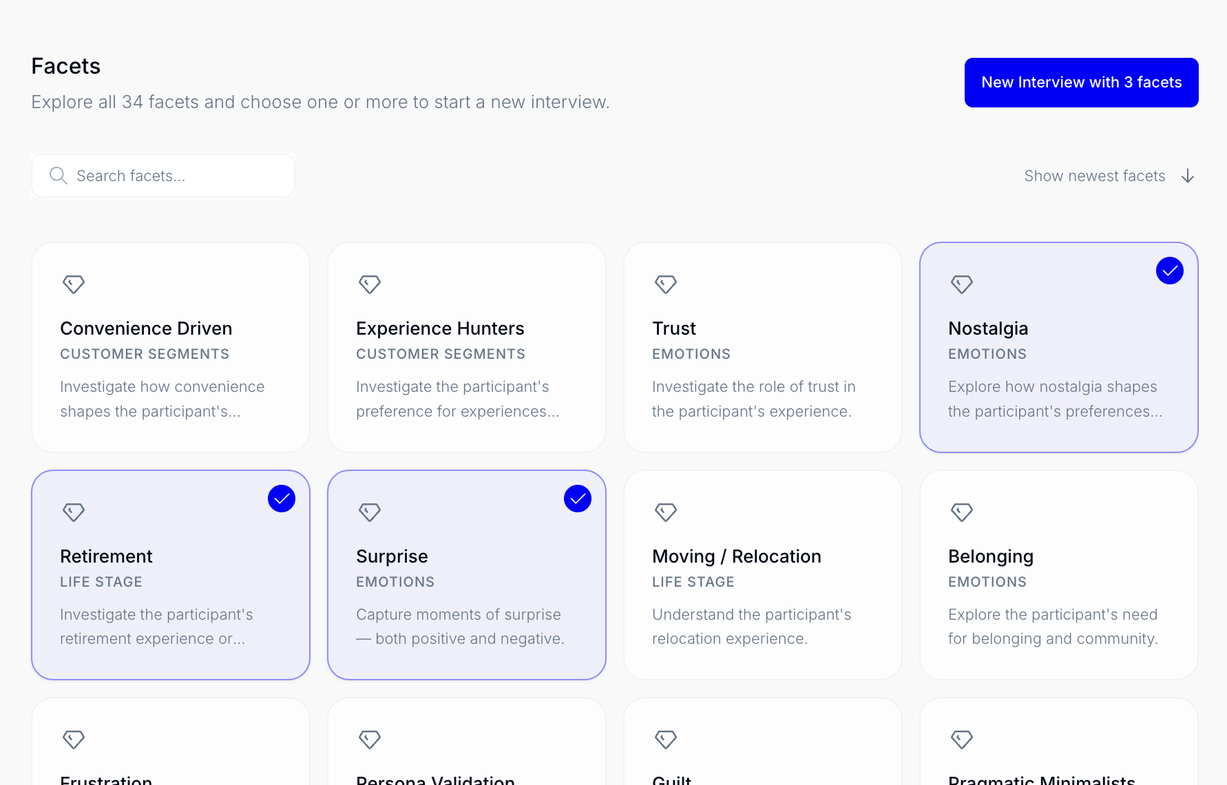 Facets are organized into collections (e.g. Customer Segments, Emotions), making it easy to explore related items.